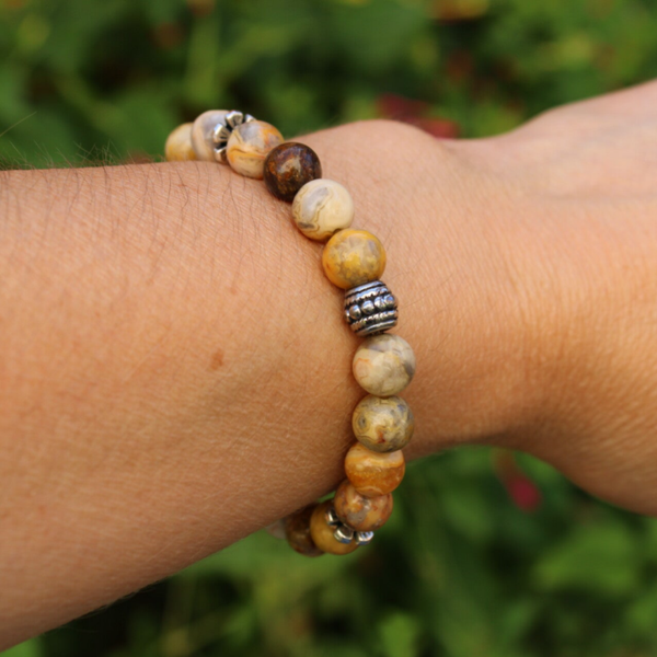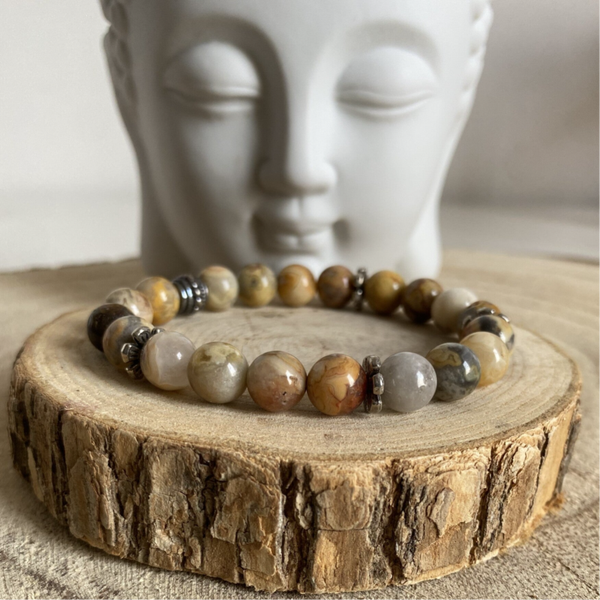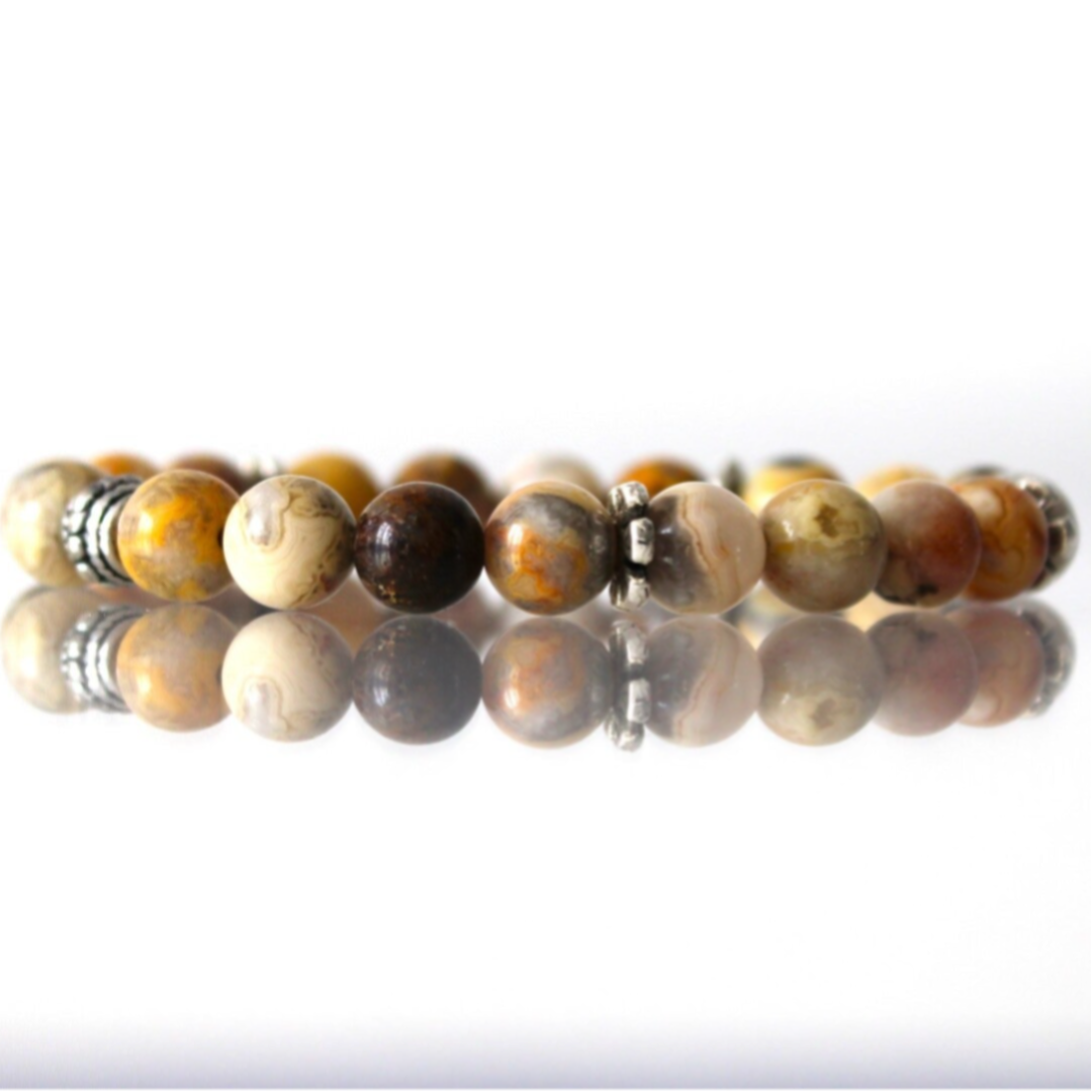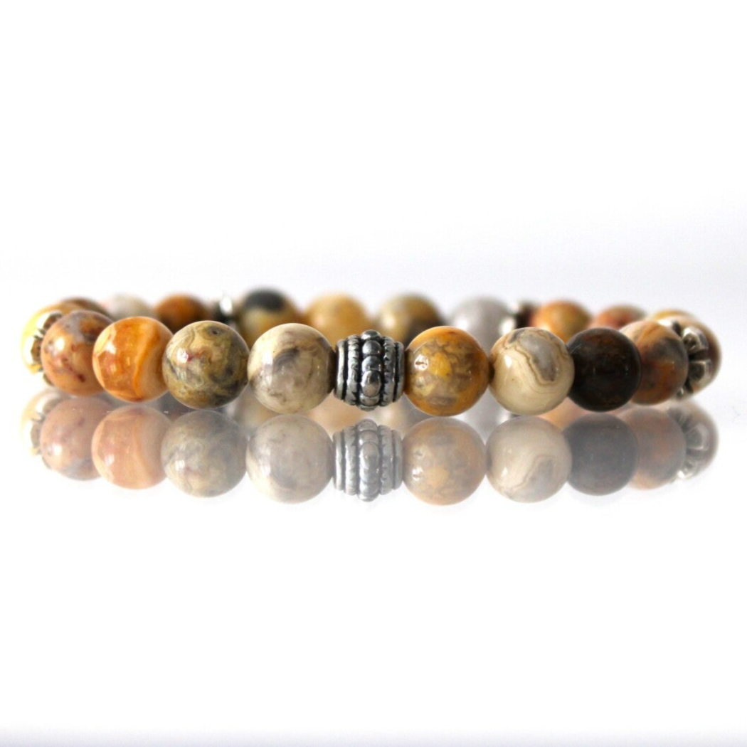 Ce beau bracelet en pierres naturelles d'Agate Crazy Lace en perles de 8 mm, est monté sur un fil élastique transparent très résistant. Les perles intercalaires sont en métal.