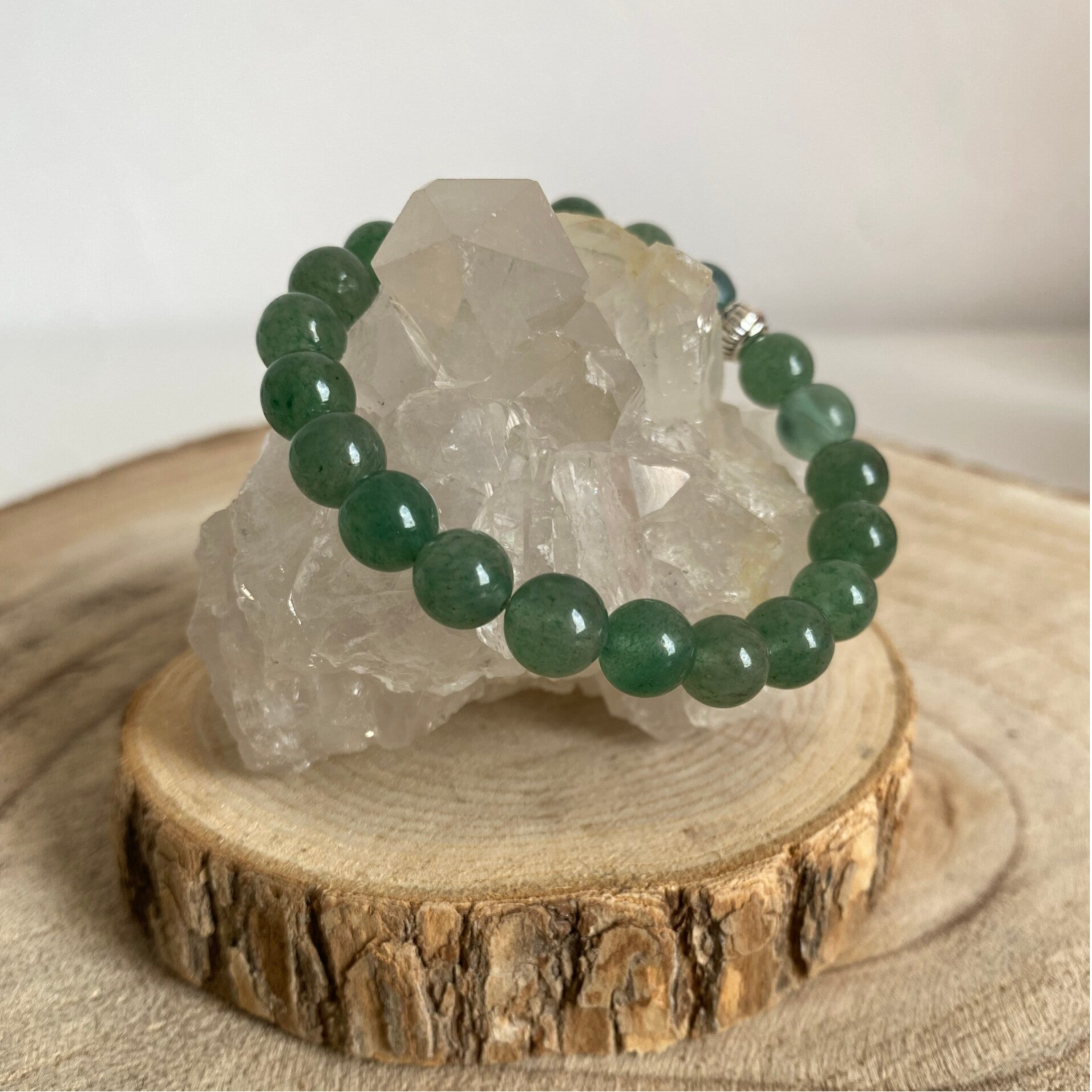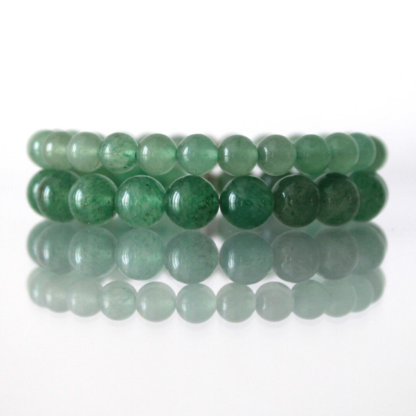 Ce beau bracelet de pierre naturelle d'Aventurine verte en perles de 8 ou 6mm, est monté sur un fil élastique transparent très résistant. La perle intercalaire est en métal couleur argent.