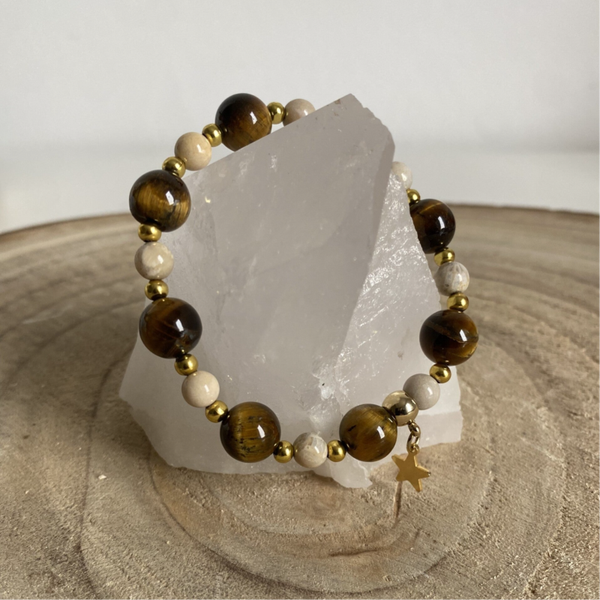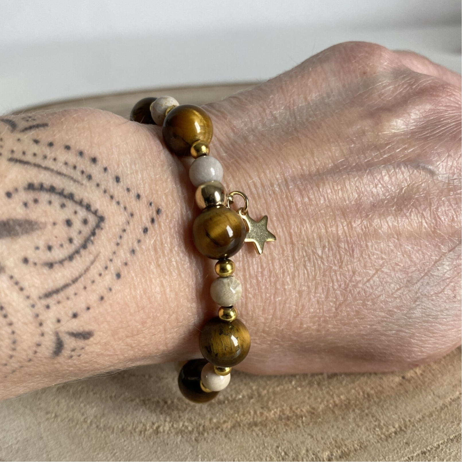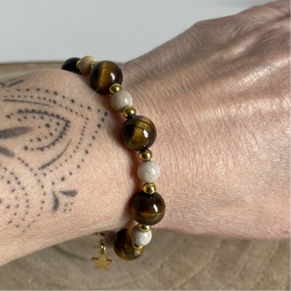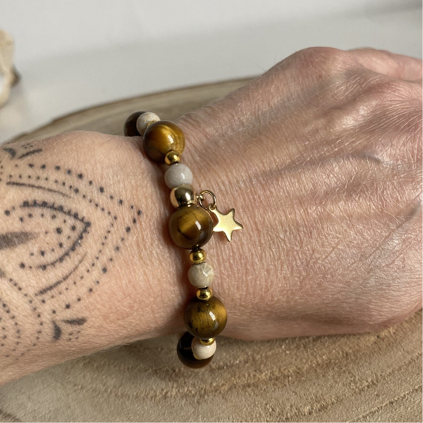 Ce beau bracelet en pierres naturelles de 10 mm & 6mm, est monté sur un fil élastique transparent très résistant. Les perles intercalaires et la breloque étoile, sont en acier inoxydable. L'acier inoxydable est un métal résistant à la corrosion (donc à la rouille) et hypoallergénique.