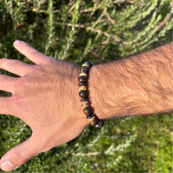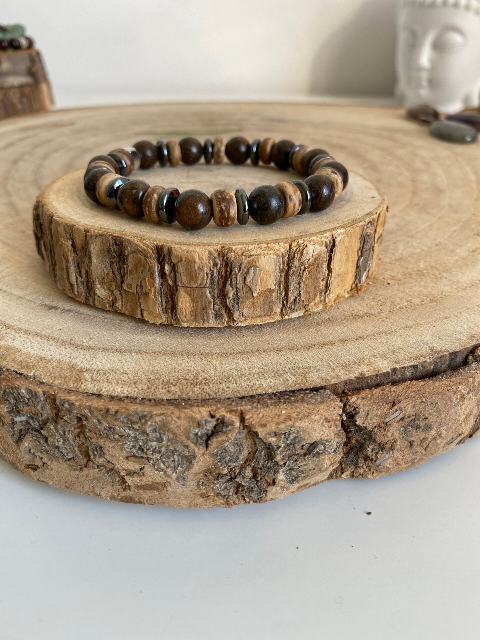 Ce beau bracelet en pierres naturelles de 8 mm, est monté sur un fil élastique transparent très résistant. Perles rondelles en coco et une perle intercalaire carré en acier inoxydable, résistantes à la corrosion et hypoallergénique.