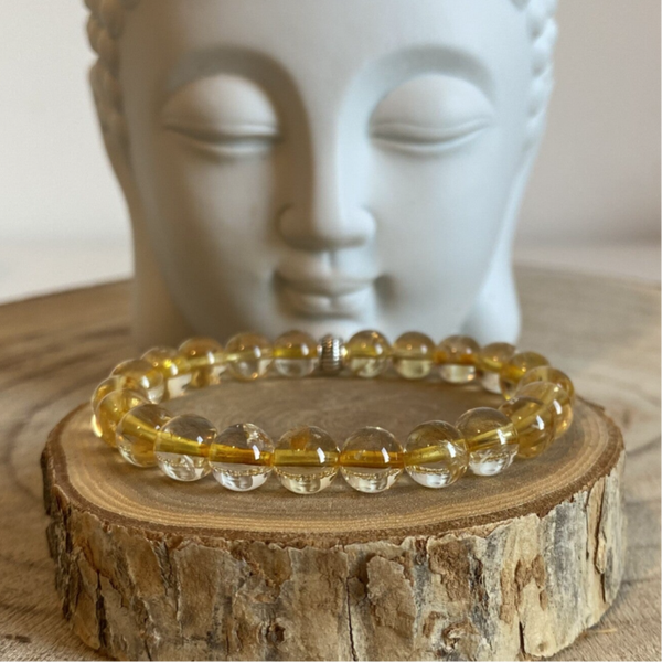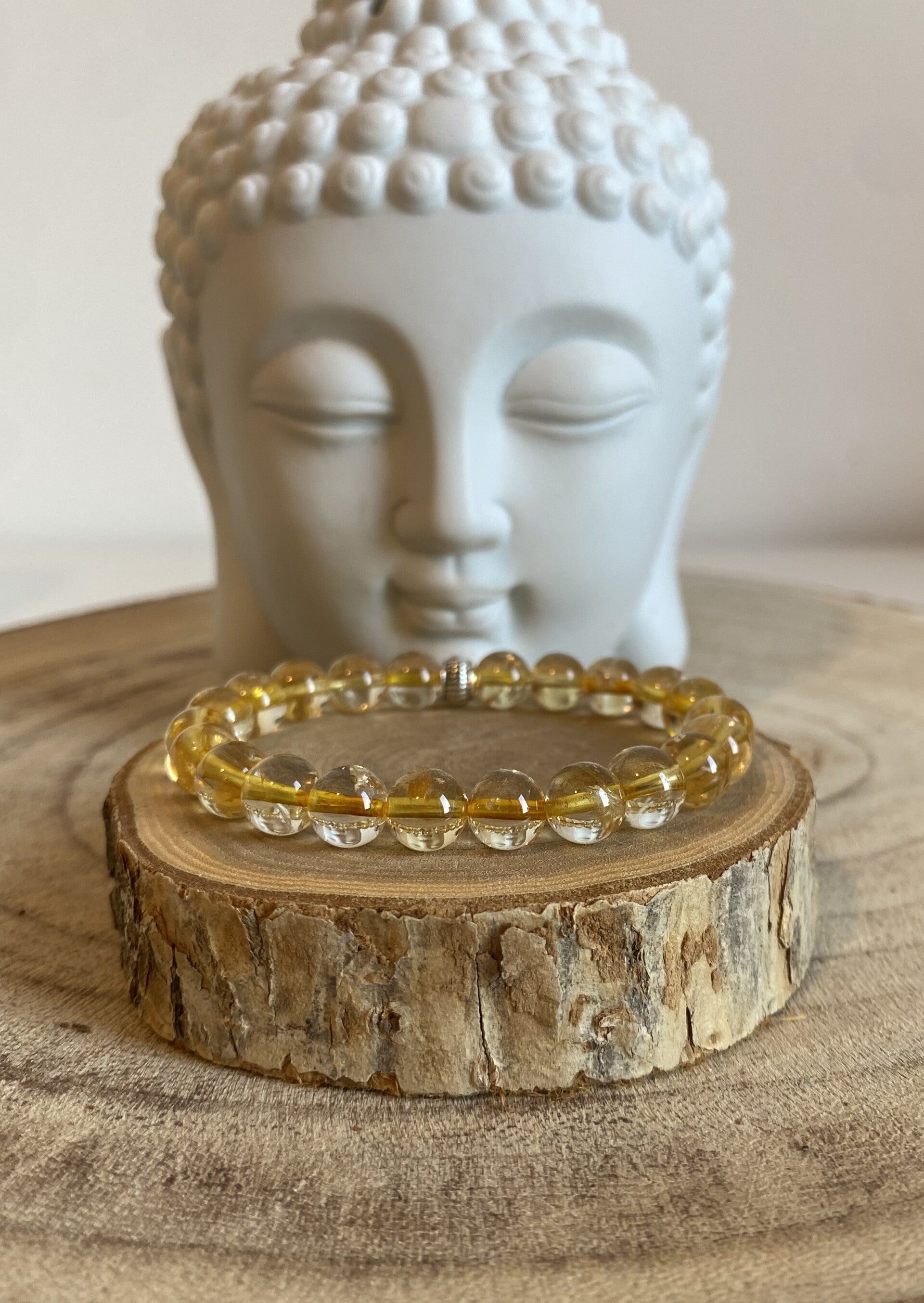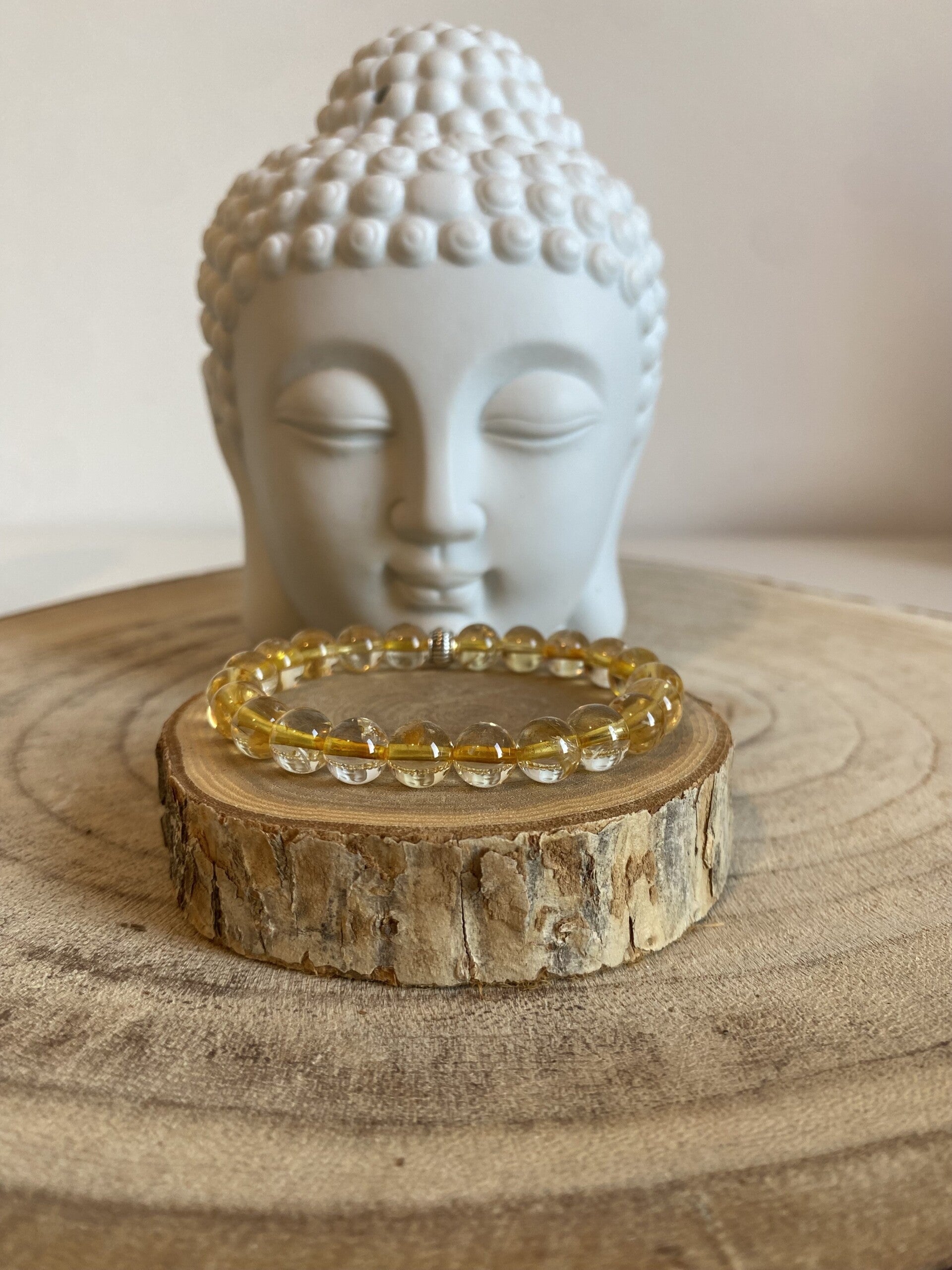 Ce beau bracelet en pierre naturelle de Citrine de 8 mm, est monté sur un fil élastique transparent très résistant. La perle intercalaire est en métal.